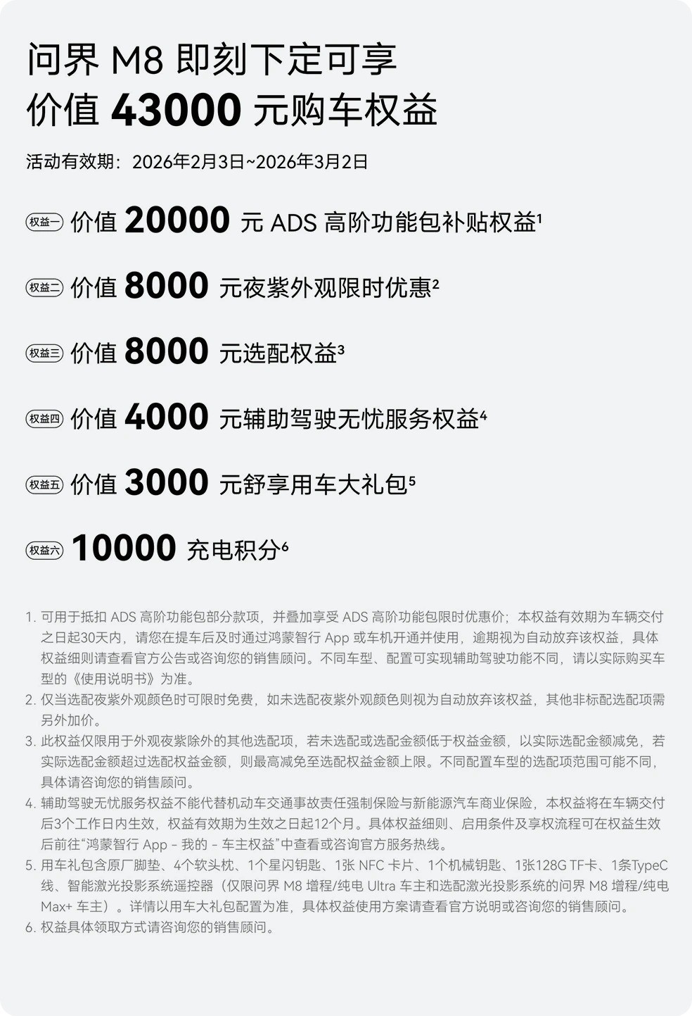 不少家庭都在期待一个“新年开新车”的契机,希望能在春节期间享受到实实在在的优惠。问界为大家准备了诚意十足的超值福利,在2026年2月3日至3月2日期间,下定问界M8的用户可享总价值43000元的购车权益,其中包括价值20000元ADS高阶功能包补贴权益、价值8000元夜紫外观限时优惠、价值8000元选配权益、价值4000元辅助驾驶无忧服务权益、价值3000元舒享用车大礼包及10000充电积分。